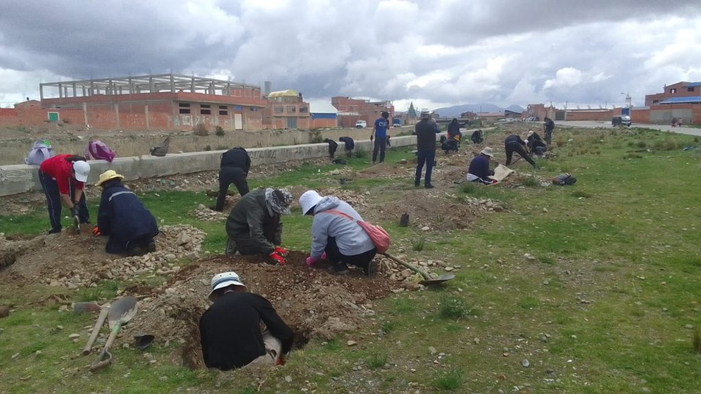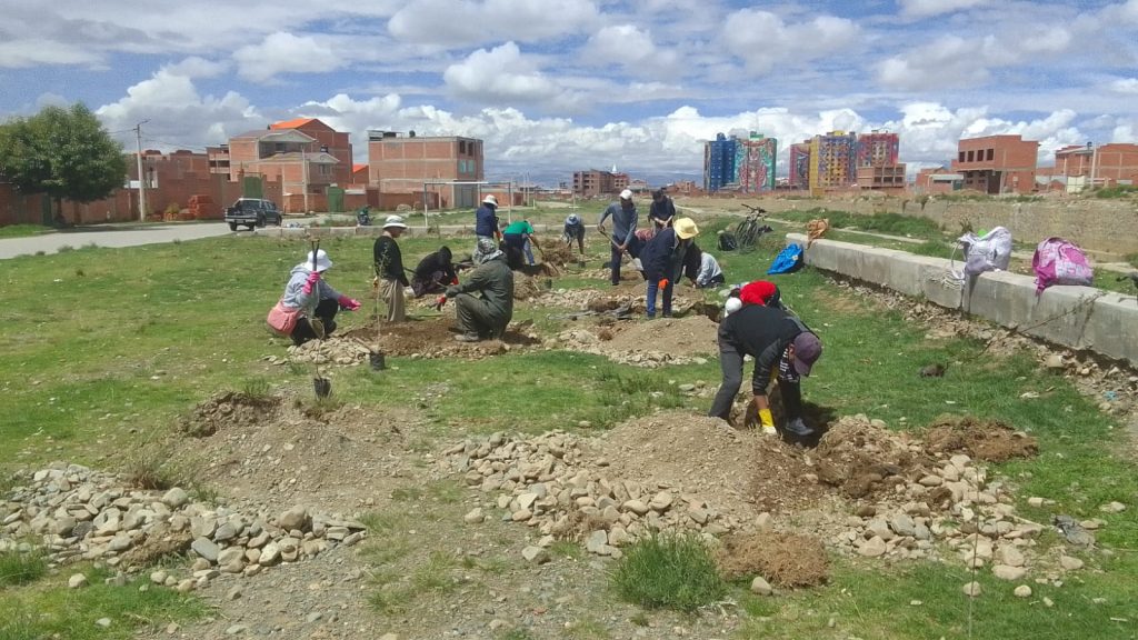 La Alcaldía de El Alto junto a 37 estudiantes de la Facultad de Economía de la UMSA de La Paz llevaron adelante este domingo una arborización sembrando 300 plantines en los lechos del río Seco a unos 500 metros del edificio municipal del Jach’a Uta para ayudar al medioambiente y además proteger al sector de eventuales riesgos.