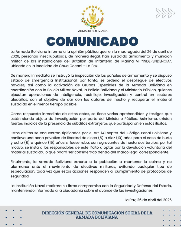 En este sentido, la Armada Boliviana exhortó a los responsables a optar por la devolución voluntaria del material sustraído, “lo que podrá ser considerado dentro del marco legal correspondiente”.