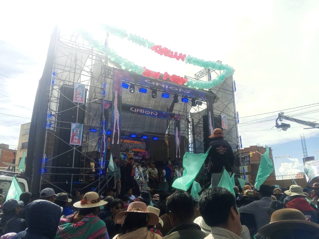 Escenarios similares se registraron en municipios cercanos a El Alto, como Pucarani, donde varias organizaciones políticas instalaron escenarios en la vía troncal de ingreso al municipio para recibir a sus postulantes y realizar actos con música en vivo.
