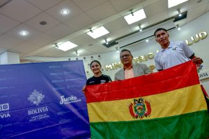 El viceministro de Promoción, Vigilancia Epidemiológica, Max Enríquez, junto a los abanderados nacionales. Ostentando el rojo, amarillo y verde, este...