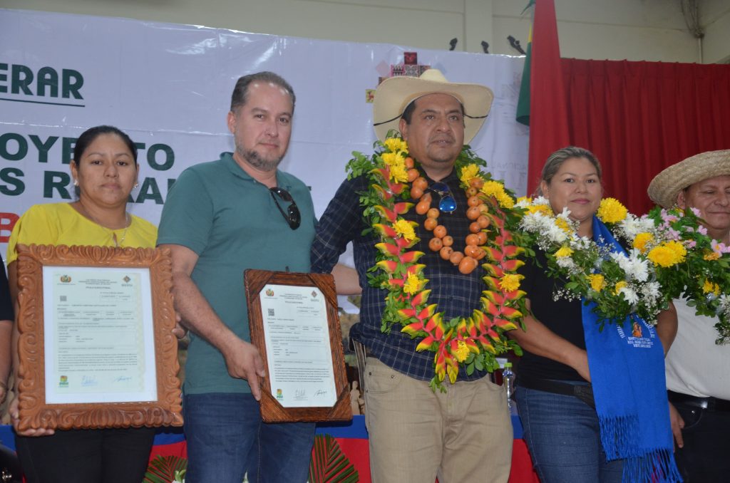 En homenaje a la efeméride departamental del Beni, el Ministro de Desarrollo Rural y Tierras, Yamil Flores Lazo, entregó este sábado de 21 convenios para la ejecución de proyectos productivos con el Programa EMPODERAR – PAR III y 57 títulos ejecutoriales del INRA, para beneficio de 543 familias de pequeños productores.