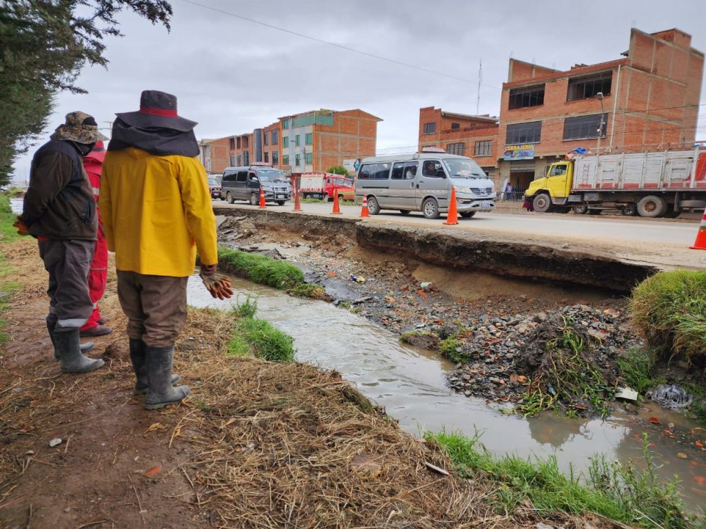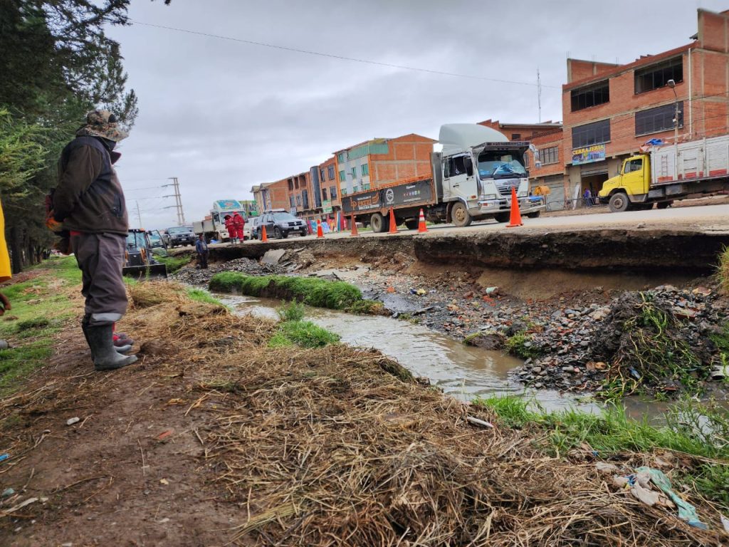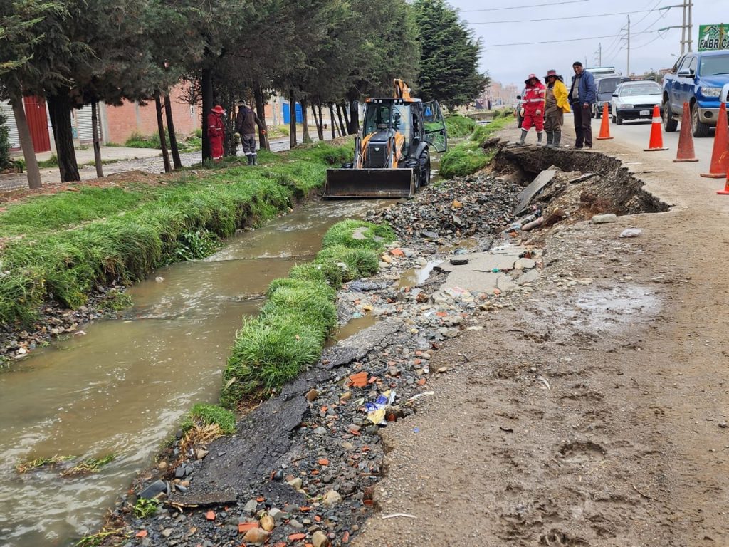 “Se identificó el desprendimiento de la plataforma por el socavamiento del agua y por cedió la plataforma”, señaló el secretario municipal de Agua Saneamiento Gestión Ambiental y Riesgos (SMASGAR), Gabriel Pari. El río es conocido como Canal Viacha y divide el Distrito 8 del Distrito 12.