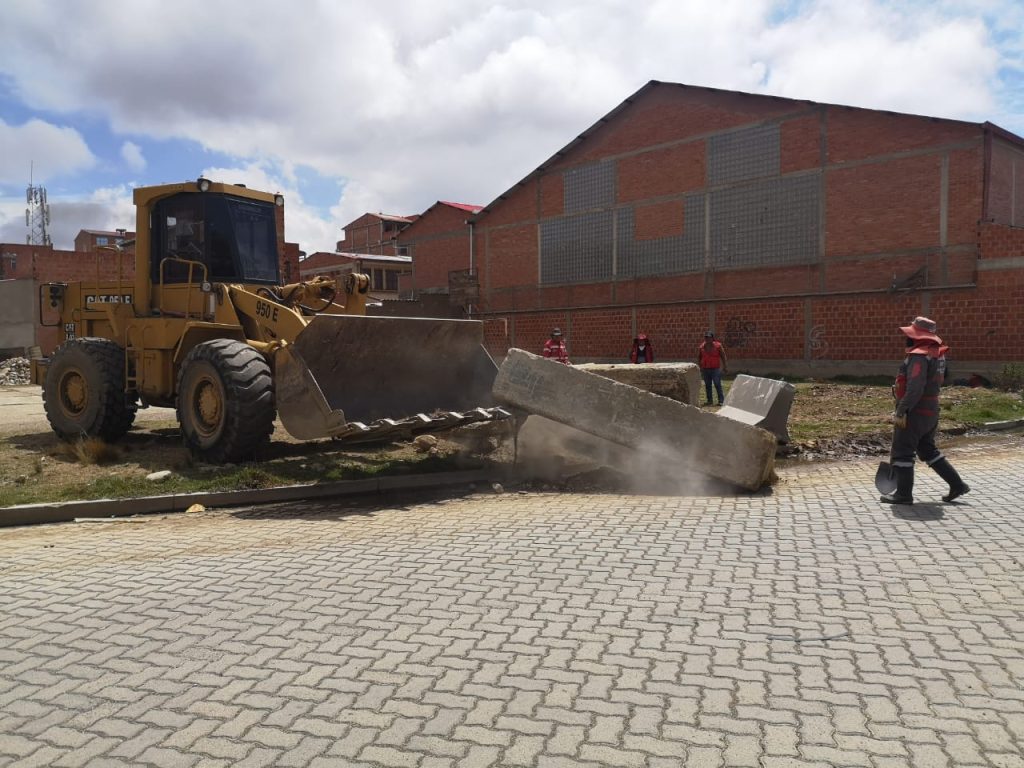 Con el fin evitar riesgos en la temporada de lluvia, obreros del Centro de Operaciones de Emergencia (COE) de la Alcaldía de El Alto instalan defensivos en la avenida Panorámica del Distrito 1 para encauzar las aguas pluviales que llegan hasta la zona Anexo Santa Rosa.