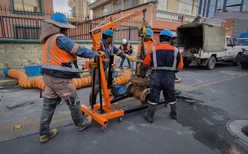 La Empresa Pública Social de Agua y Saneamiento (EPSAS S.A.) realiza el cambio de una válvula en la calle 18, entre la avenida Ballivián, en la zona Sur de La Paz.