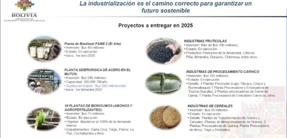 El Gobierno nacional entregará este año un importante paquete de plantas industriales, que va desde el Complejo Siderúrgico del Mutún hasta industrias frutículas, informó el ministro de Economía, Marcelo Montenegro.