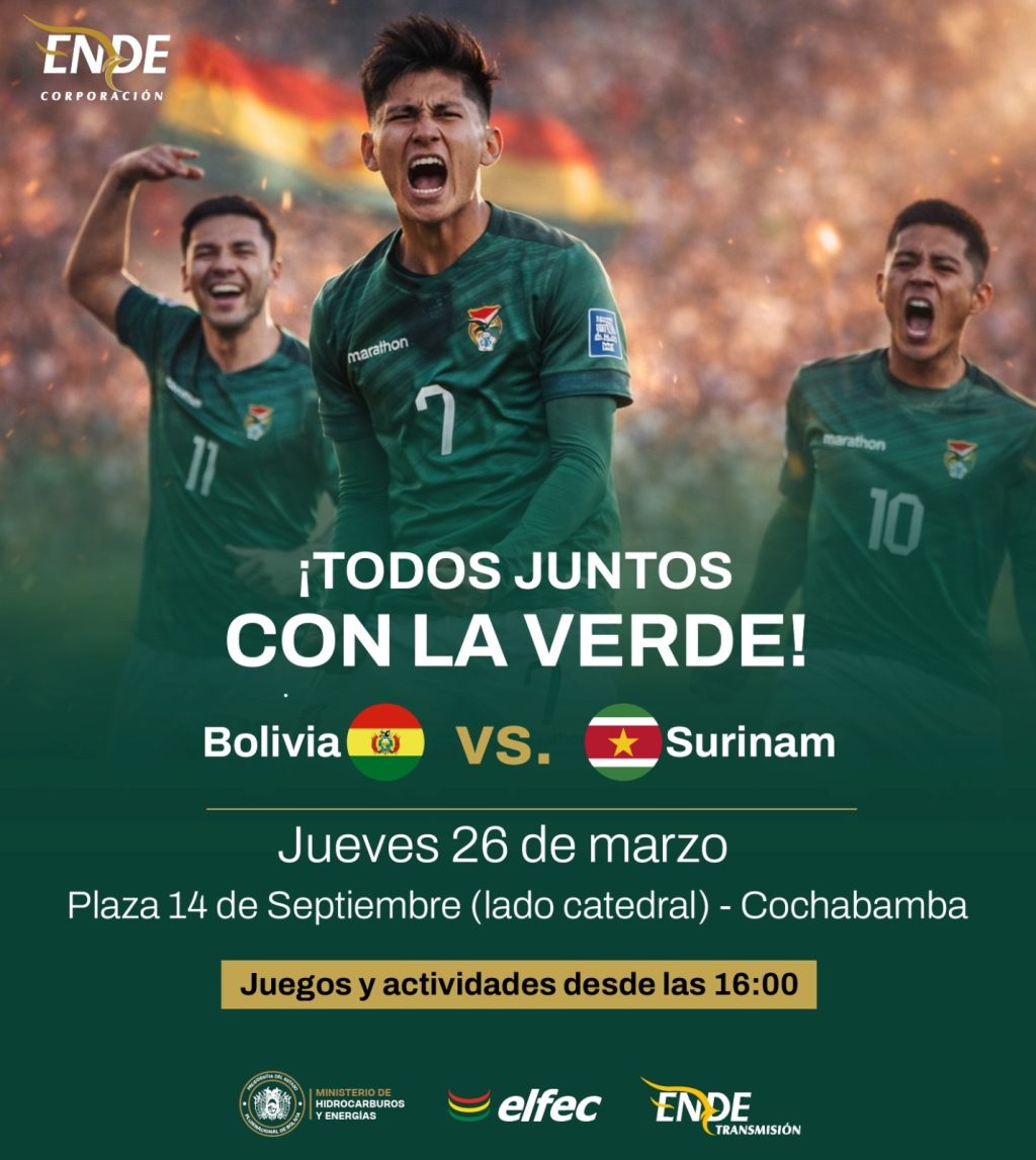 Corporación, a través de sus empresas filiales ELFEC y ENDE Transmisión, instalará este jueves 26 de marzo una pantalla gigante de 12 x 5 metros en la Plaza 14 de Septiembre de Cochabamba, para la transmisión del partido Bolivia vs. Surinam, en el marco de la campaña “La Energía de la Tricolor”.