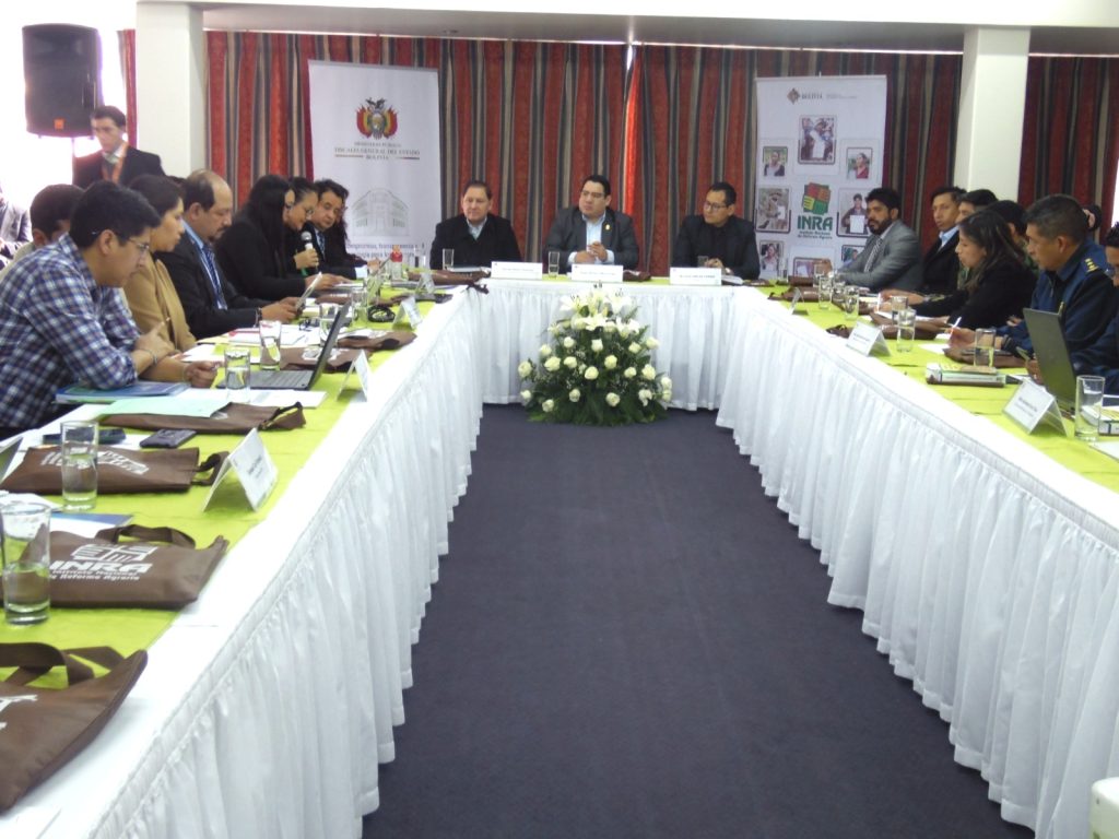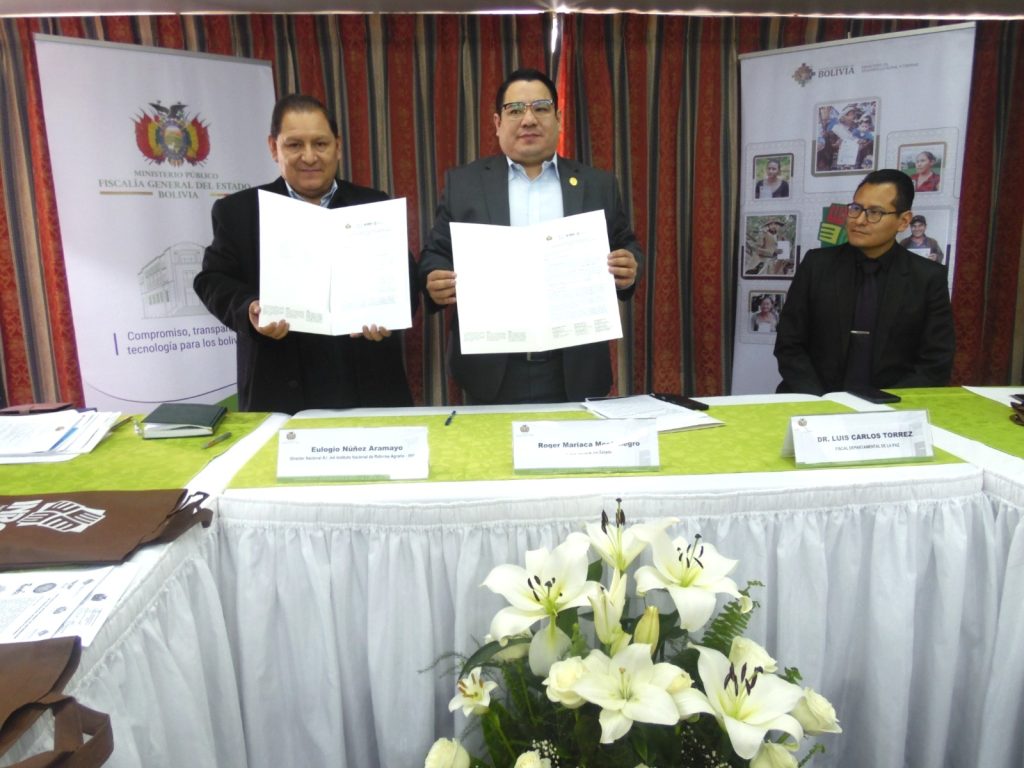 El Fiscal General del Estado, Roger Mariaca Montenegro, y el Director del Instituto Nacional de Reforma Agraria (INRA), Eulogio Núñez Aramayo, suscribieron hoy un Convenio de Cooperación Interinstitucional que tiene por objeto poner en vigencia mecanismos de intercambio de información en hechos relacionados al narcotráfico a través del Ecosistema Justicia Libre del Ministerio Público. La suscripción del documento se realizó durante la reunión de coordinación entre representantes de distintas instituciones que, en la gestión 2021, firmaron el Convenio de Cooperación Interinstitucional de lucha contra el narcotráfico vía aérea.