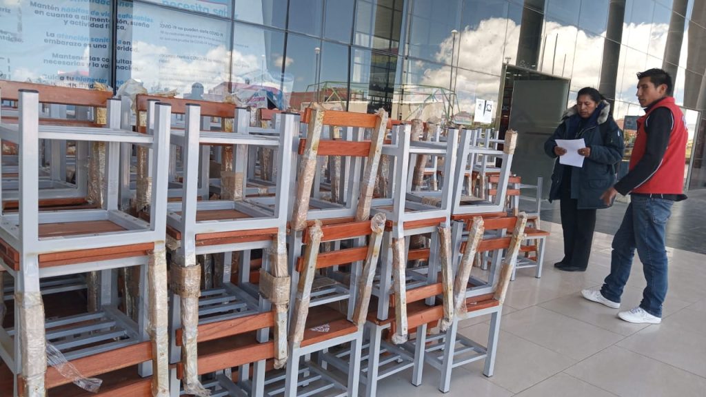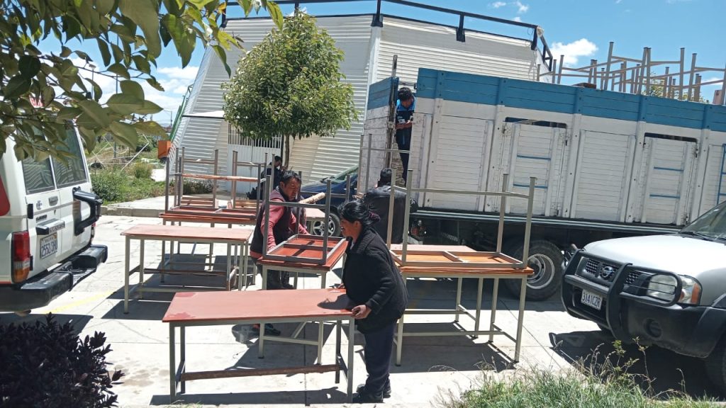 Según el acta de entrega definitiva, la Unidad Educativa Juan José Torres Gonzales recibió 203 unidades de mobiliario, entre ellos; mesas bipersonales y sillas de madera metal.