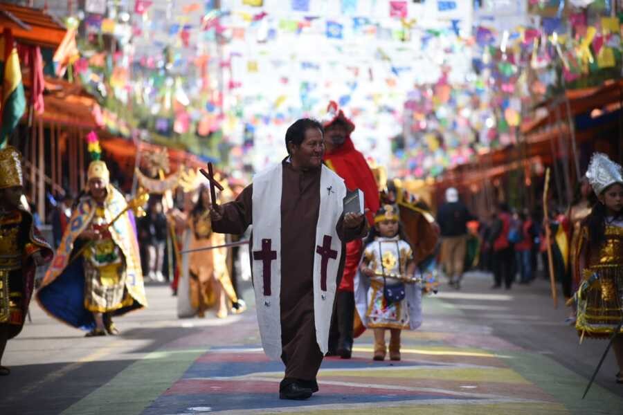 La entrada folclórica, declarada como Patrimonio Cultural, empezó con una procesión a la cabeza de monseñor Cristóbal Bialasik, obispo de la Diócesis de Oruro, con rezos y cánticos religiosos.