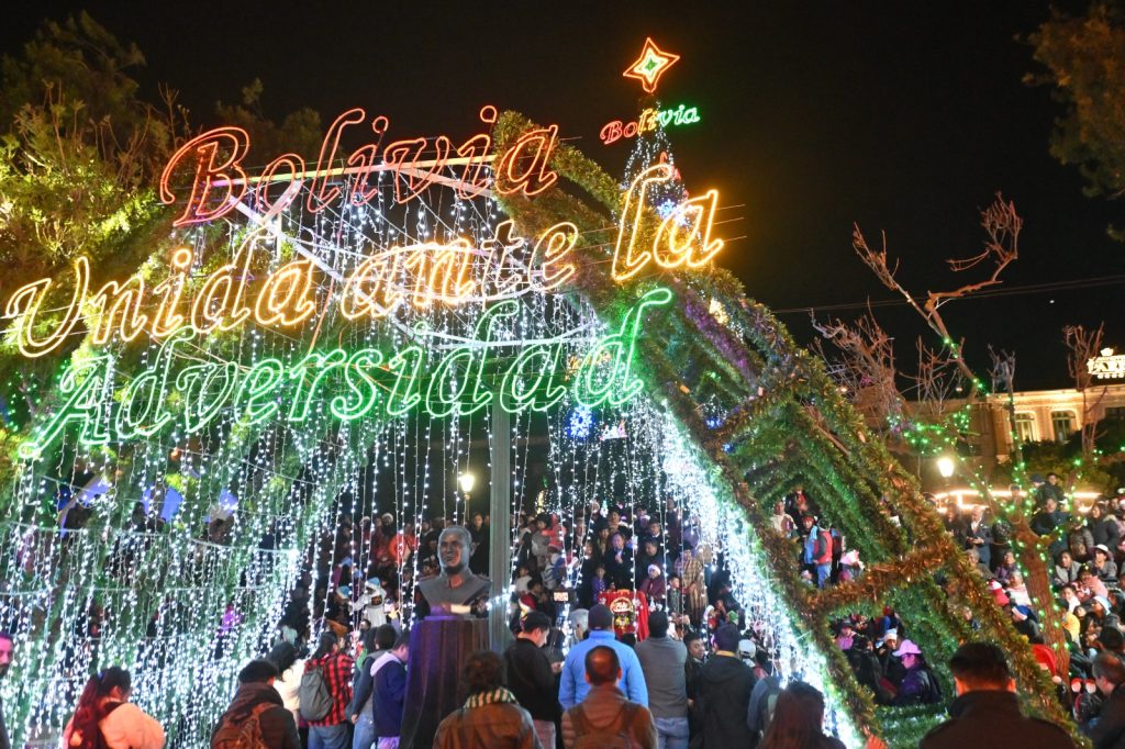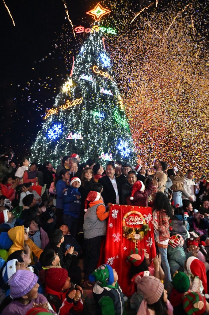 El presidente Luis Arce, acompañado del vicepresidente David Choquehuanca, llegó este domingo hasta la Plaza Murillo para realizar el tradicional encendido de las luces del árbol de navidad.