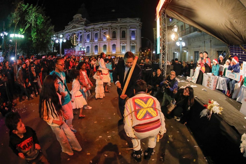Felicidades” dijo el mandatario. Al acto se dieron cita varios grupos folklóricos que amenizaron la noche con danzas típicas, villancicos y chuntunquis, con coloridas vestimentas que representaban las tradiciones de cada región.