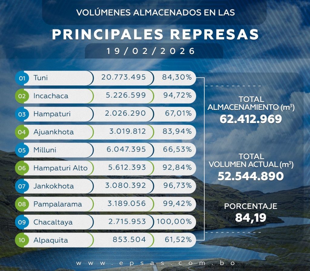 La Empresa Pública Social de Agua y Saneamiento (EPSAS S.A.) informó que el sistema de las 10 principales represas se encuentra actualmente al 84% de su capacidad total de almacenamiento, y que tres de ellas ya registran rebalse, situación considerada normal en temporada de lluvias.