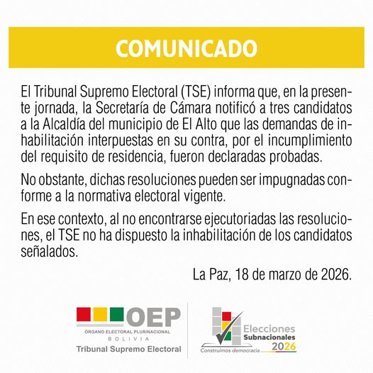 El Tribunal Supremo Electoral (TSE) informó este miércoles que se declararon probadas las demandas de inhabilitación contra tres candidatos a la Alcaldía de El Alto; sin embargo, aclaró que aún no se ha dispuesto su inhabilitación dentro del proceso.