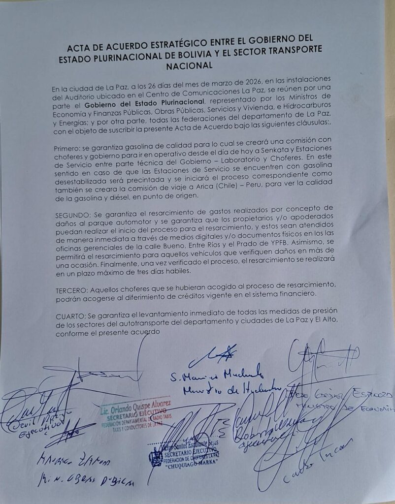 “Primero: se garantiza gasolina de calidad, para lo cual se creará una comisión con choferes y el Gobierno, que realizará operativos desde este jueves en la planta de Senkata (de Yacimientos Petrolíferos Fiscales Bolivianos – YPFB) y en estaciones de servicio, con participación de la parte técnica del Gobierno y representantes del sector”, se lee en el acuerdo.